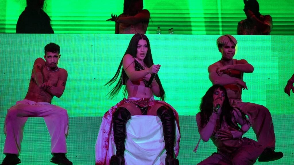 Posteriormente, el rapero utilizó la tarima principal acompañado de su grupo de bailarines y artistas invitados como Jowell y Randy -que alborotaron al público con el tema Agresivo- Baby Rasta y Gringo, Omar Courtz, De La Guetto, MC Cejas, Guelo Star y el grupo de baile los Jabbawockeez.